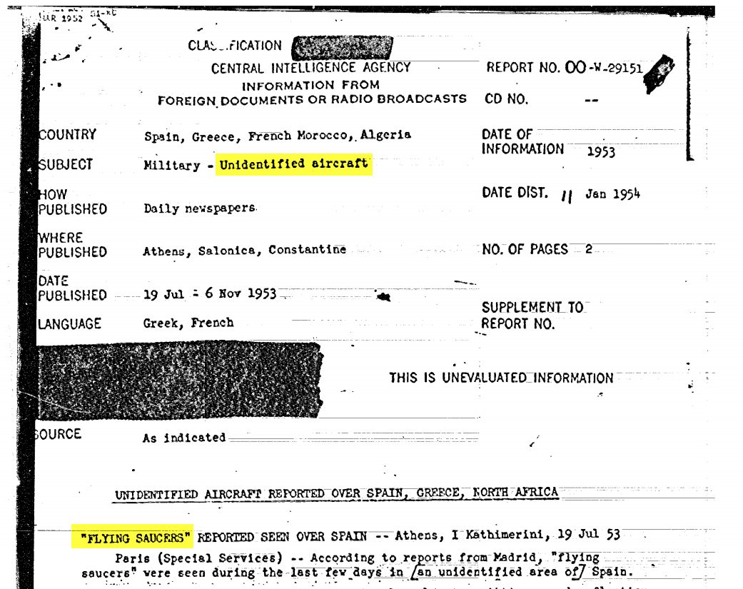 Despite the terms “flying saucer” and “unidentified flying object” or the acronym “UFO” appearing frequently throughout most official documents regarding Project Blue Book; “unidentified aircraft” not so much. So, the above excerpt connected the two-word phrase “unidentified aircraft” directly to the UFO phenomenon, on an official level. Granted, the “Condon Report” and news today about reporting procedures are separated by about 51 years; but the phrasing and use of “unidentified aircraft” is clearly a bit less mysterious (or newsworthy), which may explain why that is used to convey the same thing, without actually saying it. For those who might think this link is a coincidence, files I received by the Central Intelligence Agency (CIA) on UFOs many years ago, also connect the phrase. That connection goes back even farther from the Condon Report. For example, this 1953 CIA intelligence document, which outlined UFOs in Spain, Greece and North Africa. The CIA’s choice of phrasing for the “subject” line, despite the report itself referencing “flying saucers?” They chose “unidentified aircraft.”