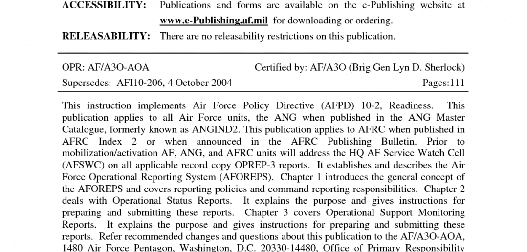 Air Force Instruction 10-206. 2008 Revision with UFO references [87 Pages] – Up until 2011, the Air Force had this publication active, and UFOs remained in it to be reported. When The Huffington Post profiled The Black Vault, and this discovery, the publication was changed within days. Reference: Air Force UFO Rules Vanish After Huffington Post Inquiry.