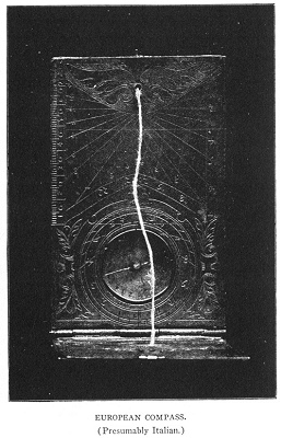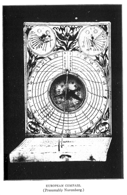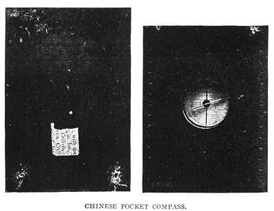 The south-pointing needle is an ancient Chinese invention which for some time seems to have been forgotten. Professor Friedrich Hirth of Columbia University has privately communicated to me facts which prove that it was employed in ancient times by travelers through the desert, that the invention was lost and had to be rediscovered. We would add, too, that the Chinese invention became known in Europe after the time of Marco Polo where it was soon used as a mariner's compass. The incident is well known and can easily be established on the testimony of literary sources, but while sauntering through the National Museum at Washington, the writer discovered a palpable evidence in the show cases there exhibited, which displayed the Chinese pocket instruments containing south-pointing needles presumably a few centuries old, side by side with European compasses. They are of the same oblong shape and consist of two tablets hinged in the same manner. The European instruments have sun-dials in addition and are decidedly more serviceable for practical use but we can not doubt that for the original idea our ancestors are indebted to our Mongol fellow-men. *