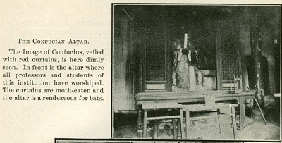 The Image of Confucius, veiled with red curtains, is here dimly seen. In front is the altar where all professors and students of this institution have worshiped. The curtains are moth-eaten and the altar is a rendezvous for bats.