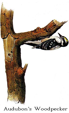AUDUBON'S WOODPECKER. [Hairy Woodpecker (see also Canadian Woodpecker, Phillips' Woodpecker, Maria's Woodpecker, Harris' Woodpecker, and Hairy Woodpecker).] |