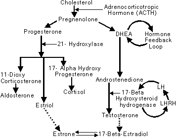 DHEA is manufactured from Cholesterol in the body. Interestingly, while DHEA levels decline with age Cholesterol levels tend to rise. This has lead to speculation that there is some enzymatic conversion process that degrades with age. As Pregnenolone levels also fall with age, it is likely that this degradation is related to the interaction of ACTH on the conversion of Cholesterol. Normally, Pregnenolone proceeds along metabolic pathways to become either Progesterone or DHEA. Progesterone proceeds to Cortisol and other glucocorticoids, Aldosterone and the mineral-corticoids via 21-Hydroxylase. This Hydroxylase enzyme is critical to the production of a wide range of corticosteroids. Individuals who are deficient in this enzyme experience significant, often devastating behavioral and physical sexual development problems. It is important, however, to know that excess levels of the enzyme are nearly equally problematic, though in very different ways. We have heard rumors that there is a black market in substances that inhibit this enzyme. They are being promoted as a natural way to cause your body to manufacture anabolic steroids. There is no truth to this assertion and use of such products, assuming they are not totally bogus, could cause heart failure due to potassium insufficiency. Stay clear!