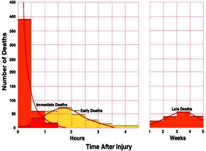Most dictionaries define trauma as: "a body injury produced by violence or any thermal, chemical, or other extrinsic agent". This "body injury" may not be at all obvious. It may be an internal disruption of body function that cannot be seen. However, you might note that three times as many, or some 450,000 additional people who, also, endure trauma, yet do not die, says this distinguished periodical, will, nevertheless, suffer permanent disability! This adds up to the horrifying toll of some 600,000 young Americans annually, who either die suddenly or suffer life-long disability . . . many of whom may not have a scratch on them! (Aren’t they as important as those who have AIDS?) High Stress Actually, Dr. Irwin Stone, world pioneer on vitamin C, pointed out to me, in 1970, that some 50% of those who die in automobile accidents suffer no real bodily injury, yet die from the trauma, the high stress of the accident. The chart furnished by The Scientific American in their excellent CD, shows the timing of 862 mysterious deaths from trauma, over a two year period, at a San Francisco General Hospital: