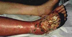 infection, dorsal aspect of right foot has an opening of 10 cm x 7cm