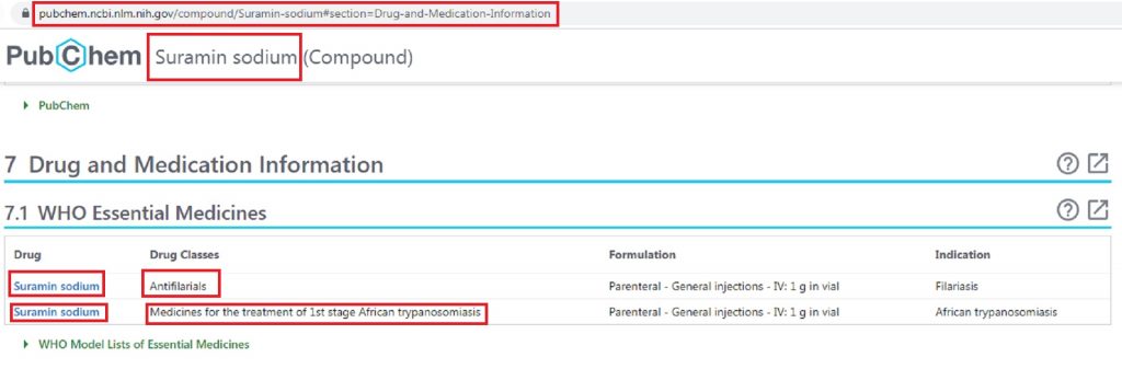 As you can see below that Dr.Judy did not make up the story that Suramin is WHO Essential Medicine. Source : https://pubchem.ncbi.nlm.nih.gov