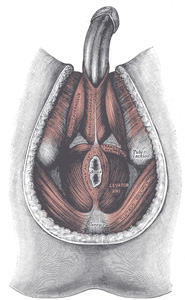 | The Bulbocavernosus (Ejaculator urinæ; Accelerator urinæ) is placed in the middle line of the perineum, in front of the anus. It consists of two symmetrical parts, united along the median line by a tendinous raphé. It arises from the central tendinous point of the perineum and from the median raphé in front. Its fibers diverge like the barbs of a quill-pen; the most posterior form a thin layer, which is lost on the inferior fascia of the urogenital diaphragm; the middle fibers encircle the bulb and adjacent parts, of the corpus cavernosum urethræ, and join with the fibers of the opposite side, on the upper part of the corpus cavernosum urethræ, in a strong aponeurosis; the anterior fibers, spread out over the side of the corpus cavernosum penis, to be inserted partly into that body, anterior to the Ischiocavernosus, occasionally extending to the pubis, and partly ending in a tendinous expansion which covers the dorsal vessels of the penis. The latter fibers are best seen by dividing the muscle longitudinally, and reflecting it from the surface of the corpus cavernosum urethræ. | 19 |