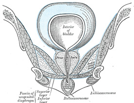 | The superior fascia of the urogenital diaphragm is continuous with the obturator fascia and stretches across the pubic arch. If the obturator fascia be traced medially after leaving the Obturator internus muscle, it will be found attached by some of its deeper or anterior fibers to the inner margin of the pubic arch, while its superficial or posterior fibers pass over this attachment to become continuous with the superior fascia of the urogenital diaphragm. Behind, this layer of the fascia is continuous with the inferior fascia and with the fascia of Colles; in front it is continuous with the fascial sheath of the prostate, and is fused with the inferior fascia to form the transverse ligament of the pelvis. | 26 |