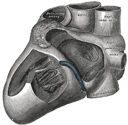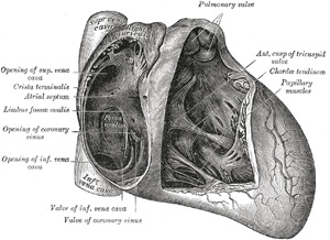 | On the atrial septum may be seen a lunated impression, bounded below by a crescentic ridge, the concavity of which is turned upward. The depression is just above the fossa ovalis of the right atrium. | 40 |