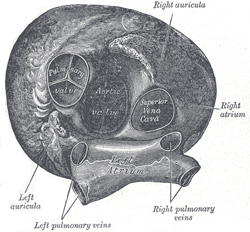 | The principal cavity is cuboidal in form, and concealed, in front, by the pulmonary artery and aorta; in front and to the right it is separated from the right atrium by the atrial septum; opening into it on either side are the two pulmonary veins. | 34 |