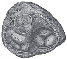 | The right atrioventricular orifice is the large oval aperture of communication between the right atrium and ventricle. Situated at the base of the ventricle, it measures about 4 cm. in diameter and is surrounded by a fibrous ring, covered by the lining membrane of the heart; it is considerably larger than the corresponding aperture on the left side, being sufficient to admit the ends of four fingers. It is guarded by the tricuspid valve. | 28 |