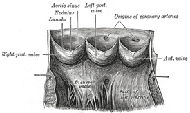 | The aortic semilunar valves (Figs. 494, 497) are three in number, and surround the orifice of the aorta; two are anterior (right and left) and one posterior. They are similar in structure, and in their mode of attachment, to the pulmonary semilunar valves, but are larger, thicker, and stronger; the lunulæ are more distinct, and the noduli or corpora Arantii thicker and more prominent. Opposite the valves the aorta presents slight dilatations, the aortic sinuses (sinuses of Valsalva), which are larger than those at the origin of the pulmonary artery. | 46 |