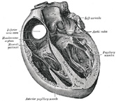 | The bicuspid or mitral valve (valvula bicuspidalis [metralis]) (Figs. 495, 496) is attached to the circumference of the left atrioventricular orifice in the same way that the tricuspid valve is on the opposite side. It consists of two triangular cusps, formed by duplicatures of the lining membrane, strengthened by fibrous tissue, and containing a few muscular fibers. The cusps are of unequal size, and are larger, thicker, and stronger than those of the tricuspid valve. The larger cusp is placed in front and to the right between the atrioventricular and aortic orifices, and is known as the anterior or aortic cusp; the smaller or posterior cusp is placed behind and to the left of the opening. Two smaller cusps are usually found at the angles of junction of the larger. The cusps of the bicuspid valve are furnished with chordæ tendineæ, which are attached in a manner similar to those on the right side; they are, however, thicker, stronger, and less numerous. | 45 |
