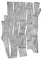 | FIG. 499 Anastomosing muscular fibers of the heart seen in a longitudinal section. On the right the limits of the separate cells with their nuclei are exhibited somewhat diagrammatically. (See enlarged image) | | |