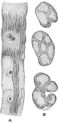 | FIG. 500 Purkinjes fibers from the sheeps heart. A. In longitudinal section. B. In transverse section. (See enlarged image) | | |