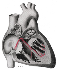 | FIG. 501 Schematic representation of the atrioventricular bundle of His. The bundle, represented in red originates near the orifice of the coronary sinus, undergoes slight enlargement to form a node, passes forward to the ventricular septum, and divides into two limbs. The ultimate distribution cannot be completely shown in this diagram. (See enlarged image) | | |