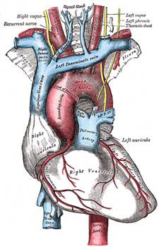 | | | Relations.The arch of the aorta is covered anteriorly by the pleuræ and anterior margins of the lungs, and by the remains of the thymus. As the vessel runs backward its left side is in contact with the left lung and pleura. Passing downward on the left side of this part of the arch are four nerves; in order from before backward these are, the left phrenic, the lower of the superior cardiac branches of the left vagus, the superior cardiac branch of the left sympathetic, and the trunk of the left vagus. As the last nerve crosses the arch it gives off its recurrent branch, which hooks around below the vessel and then passes upward on its right side. The highest left intercostal vein runs obliquely upward and forward on the left side of the arch, between the phrenic and vagus nerves. On the right are the deep part of the cardiac plexus, the left recurrent nerve, the esophagus, and the thoracic duct; the trachea lies behind and to the right of the vessel. Above are the innominate, left common carotid, and left subclavian arteries, which arise from the convexity of the arch and are crossed close to their origins by the left innominate vein. Below are the bifurcation of the pulmonary artery, the left bronchus, the ligamentum arteriosum, the superficial part of the cardiac plexus, and the left recurrent nerve. As already stated, the ligamentum arteriosum connects the commencement of the left pulmonary artery to the aortic arch. | 9 |