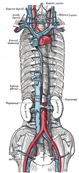 | The Right Innominate Vein (v. anonyma dextra) is a short vessel, about 2.5 cm. in length, which begins behind the sternal end of the clavicle, and, passing almost vertically downward, joins with the left innominate vein just below the cartilage of the first rib, close to the right border of the sternum, to form the superior vena cava. It lies in front and to the right of the innominate artery; on its right side are the phrenic nerve and the pleura, which are interposed between it and the apex of the lung. This vein, at its commencement, receives the right vertebral vein; and, lower down, the right internal mammary and right inferior thyroid veins, and sometimes the vein from the first intercostal space. | 19 |