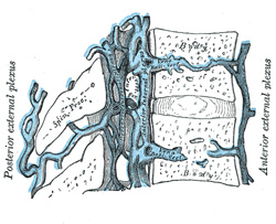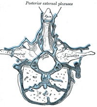 | The external vertebral venous plexuses (plexus venosi vertebrales externi; extraspinal veins) best marked in the cervical region, consist of anterior and posterior plexuses which anastomose freely with each other. The anterior external plexuses lie in front of the bodies of the vertebræ, communicate with the basivertebral and intervertebral veins, and receive tributaries from the vertebral bodies. The posterior external plexuses are placed partly on the posterior surfaces of the vertebral arches and their processes, and partly between the deep dorsal muscles. They are best developed in the cervical region, and there anastomose with the vertebral, occipital, and deep cervical veins. | 36 |
