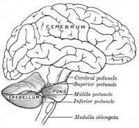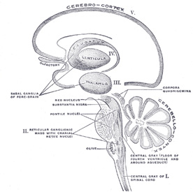 General Considerations and Divisions.The brain, is contained within the cranium, and constitutes the upper, greatly expanded part of the central nervous system. In its early embryonic condition it consists of three hollow vesicles, termed the hind-brain or rhombencephalon, the mid-brain or mesencephalon, and the fore-brain or prosencephalon; and the parts derived from each of these can be recognized in the adult (Fig. 677). Thus in the process of development the wall of the hind-brain undergoes modification to form the medulla oblongata, the pons, and cerebellum, while its cavity is expanded to form the fourth ventricle. The mid-brain forms only a small part of the adult brain; its cavity becomes the cerebral aqueduct (aqueduct ofSylvius), which serves as a tubular communication between the third and fourth ventricles; while its walls are thickened to form the corpora quadrigemina and cerebral peduncles. The fore-brain undergoes great modification: its anterior part or telencephalon expands laterally in the form of two hollow vesicles, the cavities of which become the lateral ventricles, while the surrounding walls form the cerebral hemispheres and their commissures; the cavity of the posterior part or diencephalon forms the greater part of the third ventricle, and from its walls are developed most of the structures which bound that cavity.
