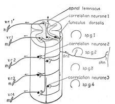 | Each sensory neuron, with its ascending and descending branches, giving off as it does many collaterals into the gray matter, each one of which may form a synapse with one or several correlation neurons, is thus brought into relation with many correlation neurons and each one of these in turn, with its ascending and descending branches and their numerous collaterals, is brought into relation, either directly or through the intercalation of additional correlation neurons, with great numbers of motor cells in the anterior column. The great complexity of these so-called simple reflex mechanisms, in the least complex portion of the nervous system the spinal cord, renders them extremely difficult of exact analysis. | 4 |