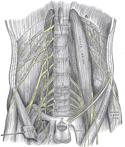 | The Iliohypogastric Nerve (n. iliohypogastricus) arises from the first lumbar nerve. It emerges from the upper part of the lateral border of the Psoas major, and crosses obliquely in front of the Quadratus lumborum to the iliac crest. It then perforates the posterior part of the Transversus abdominis, near the crest of the ilium, and divides between that muscle and the Obliquus internus abdominis into a lateral and an anterior cutaneous branch. | 7 |