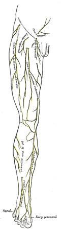 | Below the knee, the branches of the saphenous nerve are distributed to the skin of the front and medial side of the leg, communicating with the cutaneous branches of the femoral, or with filaments from the obturator nerve. | 34 |