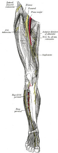 | The Saphenous Nerve (n. saphenus; long or internal saphenous nerve) (Fig. 827) is the largest cutaneous branch of the femoral nerve. It approaches the femoral artery where this vessel passes beneath the Sartorius, and lies in front of it, behind the aponeurotic covering of the adductor canal, as far as the opening in the lower part of the Adductor magnus. Here it quits the artery, and emerges from behind the lower edge of the aponeurotic covering of the canal; it descends vertically along the medial side of the knee behind the Sartorius, pierces the fascia lata, between the tendons of the Sartorius and Gracilis, and becomes subcutaneous. The nerve then passes along the tibial side of the leg, accompanied by the great saphenous vein, descends behind the medial border of the tibia, and, at the lower third of the leg, divides into two branches: one continues its course along the margin of the tibia, and ends at the ankle; the other passes in front of the ankle, and is distributed to the skin on the medial side of the foot, as far as the ball of the great toe, communicating with the medial branch of the superficial peroneal nerve. | 31 |