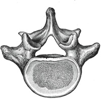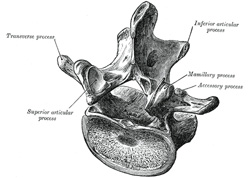 | The body is large, wider from side to side than from before backward, and a little thicker in front than behind. It is flattened or slightly concave above and below, concave behind, and deeply constricted in front and at the sides. The pedicles are very strong, directed backward from the upper part of the body; consequently, the inferior vertebral notches are of considerable depth. The laminæ are broad, short, and strong; the vertebral foramen is triangular, larger than in the thoracic, but smaller than in the cervical region. The spinous process is thick, broad, and somewhat quadrilateral; it projects backward and ends in a rough, uneven border, thickest below where it is occasionally notched. The superior and inferior articular processes are well-defined, projecting respectively upward and downward from the junctions of pedicles and laminæ. The facets on the superior processes are concave, and look backward and medialward; those on the inferior are convex, and are directed forward and lateralward. The former are wider apart than the latter, since in the articulated column the inferior articular processes are embraced by the superior processes of the subjacent vertebra. The transverse processes are long, slender, and horizontal in the upper three lumbar vertebræ; they incline a little upward in the lower two. In the upper three vertebræ they arise from the junctions of the pedicles and laminæ, but in the lower two they are set farther forward and spring from the pedicles and posterior parts of the bodies. They are situated in front of the articular processes instead of behind them as in the thoracic vertebræ, and are homologous with the ribs. Of the three tubercles noticed in connection with the transverse processes of the lower thoracic vertebræ, the superior one is connected in the lumbar region with the back part of the superior articular process, and is named the mammillary process; the inferior is situated at the back part of the base of the transverse process, and is called the accessory process (Fig. 93). | 2 |