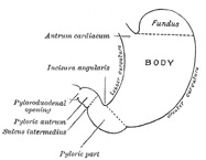 | | | Component Parts of the Stomach.A plane passing through the incisura angularis on the lesser curvature and the left limit of the opposed dilatation on the greater curvature divides the stomach into a left portion or body and a right or pyloric portion. The left portion of the body is known as the fundus, and is marked off from the remainder of the body by a plane passing horizontally through the cardiac orifice. The pyloric portion is divided by a plane through the sulcus intermedius at right angles to the long axis of this portion; the part to the right of this plane is the pyloric antrum (Fig. 1046). | 11 |