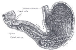 | The greater curvature (curvatura ventriculi major) is directed mainly forward, and is four or five times as long as the lesser curvature. Starting from the cardiac orifice at the incisura cardiaca, it forms an arch backward, upward, and to the left; the highest point of the convexity is on a level with the sixth left costal cartilage. From this level it may be followed downward and forward, with a slight convexity to the left as low as the cartilage of the ninth rib; it then turns to the right, to the end of the pylorus. Directly opposite the incisura angularis of the lesser curvature the greater curvature presents a dilatation, which is the left extremity of the pyloric part; this dilatation is limited on the right by a slight groove, the sulcus intermedius, which is about 2.5 cm, from the duodenopyloric constriction. The portion between the sulcus intermedius and the duodenopyloric constriction is termed the pyloric antrum. At its commencement the greater curvature is covered by peritoneum continuous with that covering the front of the organ. The left part of the curvature gives attachment to the gastrolienal ligament, while to its anterior portion are attached the two layers of the greater omentum, separated from each other by the gastroepiploic vessels. | 7 |