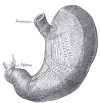 | The oblique fibers (fibræ obliquæ) internal to the circular layer, are limited chiefly to the cardiac end of the stomach, where they are disposed as a thick uniform layer, covering both surfaces, some passing obliquely from left to right, others from right to left, around the cardiac end. | 23 |