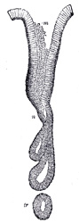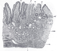 | FIG. 1054 A pyloric gland, from a section of the dogs stomach. (Ebstein.) m. Mouth. n. Neck. tr. A deep portion of a tubule cut transversely. (See enlarged image) | | |