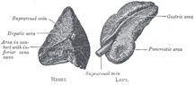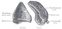 | The left suprarenal, slightly larger than the right, is crescentic in shape, its concavity being adapted to the medial border of the upper part of the left kidney. It presents a medial border, which is convex, and a lateral, which is concave; its upper end is narrow, and its lower rounded. Its anterior surface has two areas: an upper one, covered by the peritoneum of the omental bursa, which separates it from the cardiac end of the stomach, and sometimes from the superior extremity of the spleen; and a lower one, which is in contact with the pancreas and lienal artery, and is therefore not covered by the peritoneum. On the anterior surface, near its lower end, is a furrow or hilum, directed downward and forward, from which the suprarenal vein emerges. Its posterior surface presents a vertical ridge, which divides it into two areas; the lateral area rests on the kidney, the medial and smaller on the left crus of the diaphragm. | 10 |