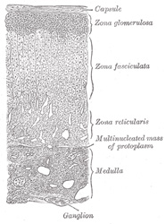 | The cortical portion (substantia corticalis) consists of a fine connective-tissue net-work, in which is imbedded the glandular epithelium. The epithelial cells are polyhedral in shape and possess rounded nuclei; many of the cells contain coarse granules, others lipoid globules. Owing to differences in the arrangement of the cells, three distinct zones can be made out: (1) the zona glomerulosa, situated beneath the capsule, consists of cells arranged in rounded groups, with here and there indications of an alveolar structure; the cells of this zone are very granular, and stain deeply. (2) The zona fasciculata, continuous with the zona glomerulosa, is composed of columns of cells arranged in a radial manner; these cells contain finer granules and in many instances globules of lipoid material. (3) The zona reticularis, in contact with the medulla, consists of cylindrical masses of cells irregularly arranged; these cells often contain pigment granules which give this zone a darker appearance than the rest of the cortex. | 14 |