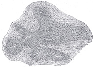 | FIG. 1187 Section of an irregular nodule of the glomus coccygeum. (Sertoli.) X 85. The section shows the fibrous covering of the nodule, the bloodvessels within it, and the epithelial cells of which it is constituted. (See enlarged image) | | |