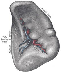 | The gastric surface (facies gastrica), which is directed forward, upward, and medialward, is broad and concave, and is in contact with the posterior wall of the stomach; and below this with the tail of the pancreas. It presents near its medial border a long fissure, termed the hilum. This is pierced by several irregular apertures, for the entrance and exit of vessels and nerves. | 5 |