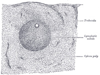 | The altered coat of the arterioles, consisting of adenoid tissue, presents here and there thickenings of a spheroidal shape, the lymphatic nodules (Malpighian bodies of the spleen). These bodies vary in size from about 0.25 mm. to 1 mm. in diameter. They are merely local expansions or hyperplasiæ of the adenoid tissue, of which the external coat of the smaller arteries of the spleen is formed. They are most frequently found surrounding the arteriole, which thus seems to tunnel them, but occasionally they grow from one side of the vessel only, and present the appearance of a sessile bud growing from the arterial wall. In transverse sections, the artery, in the majority of cases, is found in an eccentric position. These bodies are visible to the naked eye on the surface of a fresh section of the organ, appearing as minute dots of a semiopaque whitish color in the dark substance of the pulp. In minute structure they resemble the adenoid tissue of lymph glands, consisting of a delicate reticulum, in the meshes of which lie ordinary lymphoid cells (Fig. 1191). The reticulum is made up of extremely fine fibrils, and is comparatively open in the center of the corpuscle, becoming closer at its periphery. The cells which it encloses are possessed of ameboid movement. When treated with carmine they become deeply stained, and can be easily distinguished from those of the pulp. | 19 |