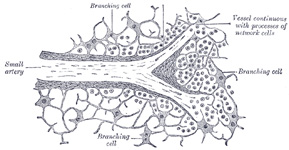 | The arterioles end by opening freely into the splenic pulp; their walls become much attenuated, they lose their tubular character, and the endothelial cells become altered, presenting a branched appearance, and acquiring processes which are directly connected with the processes of the reticular cells of the pulp (Fig. 1192). In this manner the vessels end, and the blood flowing through them finds its way into the interstices of the reticulated tissue of the splenic pulp. Thus the blood passing through the spleen is brought into intimate relation with the elements of the pulp, and no doubt undergoes important changes. | 20 |