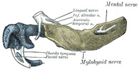 | | | Surfaces.The external surface (Fig. 176) is marked in the median line by a faint ridge, indicating the symphysis or line of junction of the two pieces of which the bone is composed at an early period of life. This ridge divides below and encloses a triangular eminence, the mental protuberance, the base of which is depressed in the center but raised on either side to form the mental tubercle. On either side of the symphysis, just below the incisor teeth, is a depression, the incisive fossa, which gives origin to the Mentalis and a small portion of the Orbicularis oris. Below the second premolar tooth, on either side, midway between the upper and lower borders of the body, is the mental foramen, for the passage of the mental vessels and nerve. Running backward and upward from each mental tubercle is a faint ridge, the oblique line, which is continuous with the anterior border of the ramus; it affords attachment to the Quadratus labii inferioris and Triangularis; the Platysma is attached below it. | 3 |