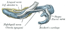 | | | Ossification.The mandible is ossified in the fibrous membrane covering the outer surfaces of Meckels cartilages. These cartilages form the cartilaginous bar of the mandibular arch (see p. 66), and are two in number, a right and a left. Their proximal or cranial ends are connected with the ear capsules, and their distal extremities are joined to one another at the symphysis by mesodermal tissue. They run forward immediately below the condyles and then, bending downward, lie in a groove near the lower border of the bone; in front of the canine tooth they incline upward to the symphysis. From the proximal end of each cartilage the malleus and incus, two of the bones of the middle ear, are developed; the next succeeding portion, as far as the lingula, is replaced by fibrous tissue, which persists to form the sphenomandibular ligament. Between the lingula and the canine tooth the cartilage disappears, while the portion of it below and behind the incisor teeth becomes ossified and incorporated with this part of the mandible. | 11 |