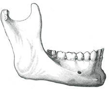 | In old age (Fig. 185) the bone becomes greatly reduced in size, for with the loss of the teeth the alveolar process is absorbed, and, consequently, the chief part of the bone is below the oblique line. The mandibular canal, with the mental foramen opening from it, is close to the alveolar border. The ramus is oblique in direction, the angle measures about 140°, and the neck of the condyle is more or less bent backward. | 18 |