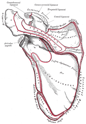 | | | Borders.Of the three borders of the scapula, the superior is the shortest and thinnest; it is concave, and extends from the medial angle to the base of the coracoid process. At its lateral part is a deep, semicircular notch, the scapular notch, formed partly by the base of the coracoid process. This notch is converted into a foramen by the superior transverse ligament, and serves for the passage of the suprascapular nerve; sometimes the ligament is ossified. The adjacent part of the superior border affords attachment to the Omohyoideus. The axillary border is the thickest of the three. It begins above at the lower margin of the glenoid cavity, and inclines obliquely downward and backward to the inferior angle. Immediately below the glenoid cavity is a rough impression, the infraglenoid tuberosity, about 2.5 cm. in length, which gives origin to the long head of the Triceps brachii; in front of this is a longitudinal groove, which extends as far as the lower third of this border, and affords origin to part of the Subscapularis. The inferior third is thin and sharp, and serves for the attachment of a few fibers of the Teres major behind, and of the Subscapularis in front. The vertebral border is the longest of the three, and extends from the medial to the inferior angle. It is arched, intermediate in thickness between the superior and the axillary borders, and the portion of it above the spine forms an obtuse angle with the part below. This border presents an anterior and a posterior lip, and an intermediate narrow area. The anterior lip affords attachment to the Serratus anterior; the posterior lip, to the Supraspinatus above the spine, the Infraspinatus below; the area between the two lips, to the Levator scapulæ above the triangular surface at the commencement of the spine, to the Rhomboideus minor on the edge of that surface, and to the Rhomboideus major below it; this last is attached by means of a fibrous arch, connected above to the lower part of the triangular surface at the base of the spine, and below to the lower part of the border. | 10 |