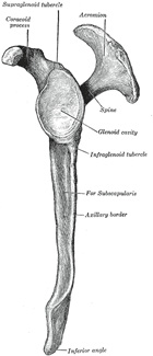 | | | Angles.Of the three angles, the medial, formed by the junction of the superior and vertebral borders, is thin, smooth, rounded, inclined somewhat lateralward, and gives attachment to a few fibers of the Levator scapulæ. The inferior angle, thick and rough, is formed by the union of the vertebral and axillary borders; its dorsal surface affords attachment to the Teres major and frequently to a few fibers of the Latissimus dorsi. The lateral angle is the thickest part of the bone, and is sometimes called the head of the scapula. On it is a shallow pyriform, articular surface, the glenoid cavity, which is directed lateralward and forward and articulates with the head of the humerus; it is broader below than above and its vertical diameter is the longest. The surface is covered with cartilage in the fresh state; and its margins, slightly raised, give attachment to a fibrocartilaginous structure, the glenoidal labrum, which deepens the cavity. At its apex is a slight elevation, the supraglenoid tuberosity, to which the long head of the Biceps brachii is attached. The neck of the scapula is the slightly constricted portion which surrounds the head; it is more distinct below and behind than above and in front. | 11 |
