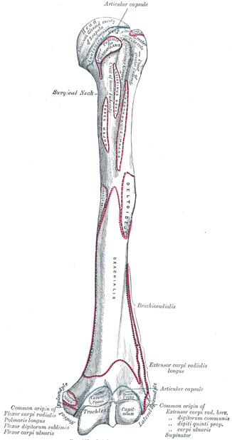 | | | Surfaces.The antero-lateral surface is directed lateralward above, where it is smooth, rounded, and covered by the Deltoideus; forward and lateralward below, where it is slightly concave from above downward, and gives origin to part of the Brachialis. About the middle of this surface is a rough, triangular elevation, the deltoid tuberosity for the insertion of the Deltoideus; below this is the radial sulcus, directed obliquely from behind, forward, and downward, and transmitting the radial nerve and profunda artery. | 12 |