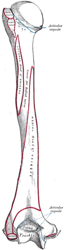 | The medial border extends from the lesser tubercle to the medial epicondyle. Its upper third consists of a prominent ridge, the crest of the lesser tubercle, which gives insertion to the tendon of the Teres major. About its center is a slight impression for the insertion of the Coracobrachialis, and just below this is the entrance of the nutrient canal, directed downward; sometimes there is a second nutrient canal at the commencement of the radial sulcus. The inferior third of this border is raised into a slight ridge, the medial supracondylar ridge, which becomes very prominent below; it presents an anterior lip for the origins of the Brachialis and Pronator teres, a posterior lip for the medial head of the Triceps brachii, and an intermediate ridge for the attachment of the medial intermuscular septum. | 11 |