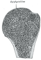 | | | Ossification (Figs. 210, 211).The humerus is ossified from eight centers, one for each of the following parts: the body, the head, the greater tubercle, the lesser tubercle, the capitulum, the trochlea, and one for each epicondyle. The center for the body appears near the middle of the bone in the eighth week of fetal life, and soon extends toward the extremities. At birth the humerus is ossified in nearly its whole length, only the extremities remaining cartilaginous. During the first year, sometimes before birth, ossification commences in the head of the bone, and during the third year the center for the greater tubercle, and during the fifth that for the lesser tubercle, make their appearance. By the sixth year the centers for the head and tubercles have joined, so as to form a single large epiphysis, which fuses with the body about the twentieth year. The lower end of the humerus is ossified as follows. At the end of the second year ossification begins in the capitulum, and extends medialward, to form the chief part of the articular end of the bone; the center for the medial part of the trochlea appears about the age of twelve. Ossification begins in the medial epicondyle about the fifth year, and in the lateral about the thirteenth or fourteenth year. About the sixteenth or seventeenth year, the lateral epicondyle and both portions of the articulating surface, having already joined, unite with the body, and at the eighteenth year the medial epicondyle becomes joined to it. | 17 |