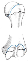 | FIG. 211 Epiphysial lines of humerus in a young adult. Anterior aspect. The lines of attachment of the articular capsules are in blue. (See enlarged image) | | |