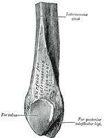 | The antero-medial border, or interosseous crest, is situated close to the medial side of the preceding, and runs nearly parallel with it in the upper third of its extent, but diverges from it in the lower two-thirds. It begins above just beneath the head of the bone (sometimes it is quite indistinct for about 2.5 cm. below the head), and ends at the apex of a rough triangular surface immediately above the articular facet of the lateral malleolus. It serves for the attachment of the interosseous membrane, which separates the Extensor muscles in front from the Flexor muscles behind. | 5 |