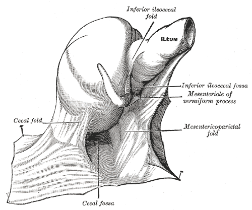 The cecal fossa. The ileum and cecum are drawn backward and upward. (Souligoux.)