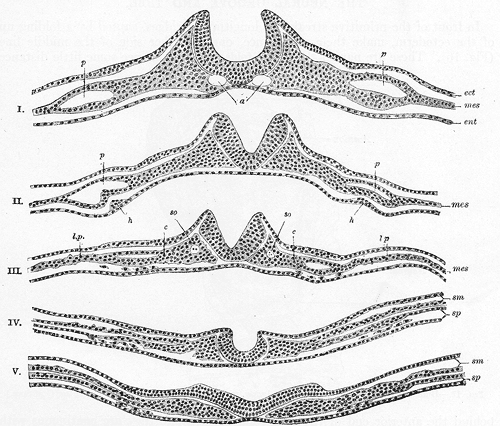| A series of transverse sections through an embryo of the dog. (After Bonnet.) Section I is the most anterior. In V the neural plate is spread out nearly flat. The series shows the uprising of the neural folds to form the neural canal. a. Aortæ. c. Intermediate cell mass. ect. Ectoderm. ent. Entoderm. h, h. Rudiments of endothelial heart tubes. In III, IV, and V the scattered cells represented between the entoderm and splanchnic layer of mesoderm are the vasoformative cells which give origin in front, according to Bonnet, to the heart tubes, h; l.p. Lateral plate still undivided in I, II, and III; in IV and V split into somatic (sm) and splanchnic (sp) layers of mesoderm. mes. Mesoderm. p. Pericardium. so. Primitive segment. |